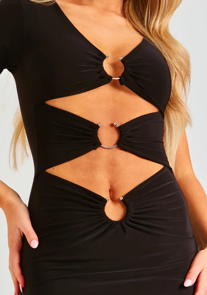 The Kaya Black Slinky Keyhole Cut Out Maxi Dress combines sleek sophistication with modern design. Crafted from a smooth, slinky fabric, it drapes elegantly to enhance your silhouette. The keyhole cut-out detail adds a subtle yet striking focal point, perfect for evening occasions or upscale events. This maxi dress offers both comfort and style, making it a versatile addition to any refined wardrobe.