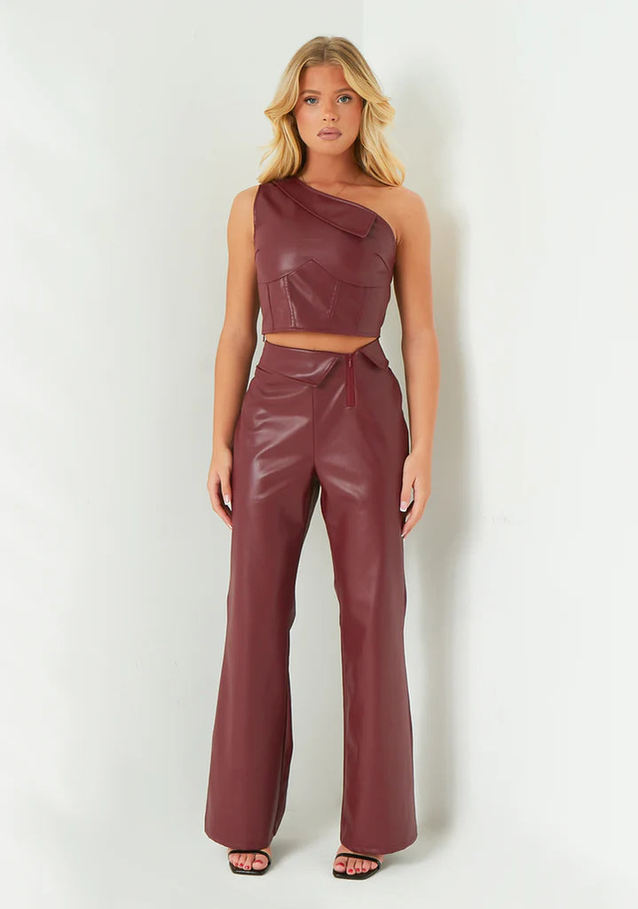 Elevate your wardrobe with the Ramona Wine Fold Over Corset Detail Faux Leather Top. Crafted from high-quality faux leather, this top features a sophisticated fold-over design and corset detailing that enhances your silhouette. Its rich wine color adds a touch of elegance, making it perfect for both day and night occasions. Designed for a flattering fit, this piece combines edgy style with refined craftsmanship, ideal for those seeking a bold yet polished look.