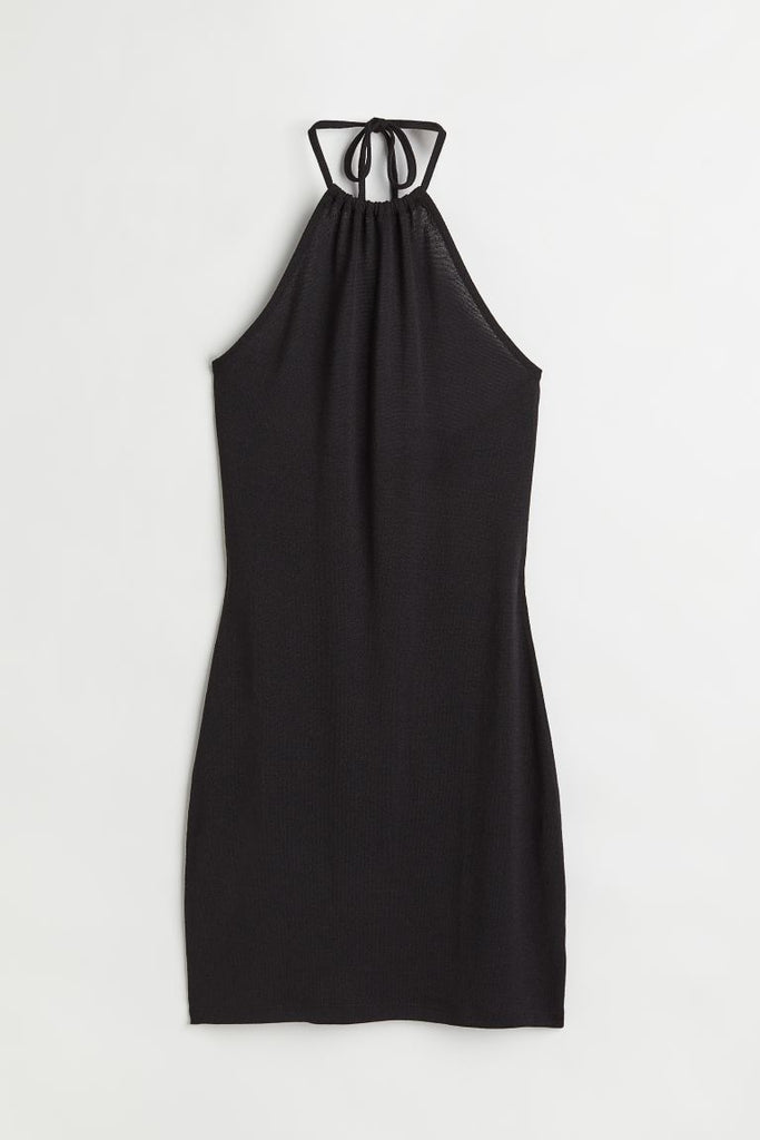 Short, fitted dress in soft jersey. narrow cut at top with narrow ties to tie at back of the neck