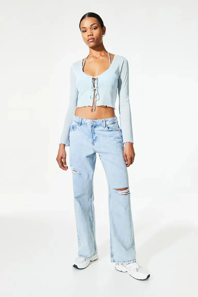 Cropped cardigan in airy mesh with a v-neck, ties down the front and long sleeves with flared cuffs. overlocked edges at the cuffs and hem