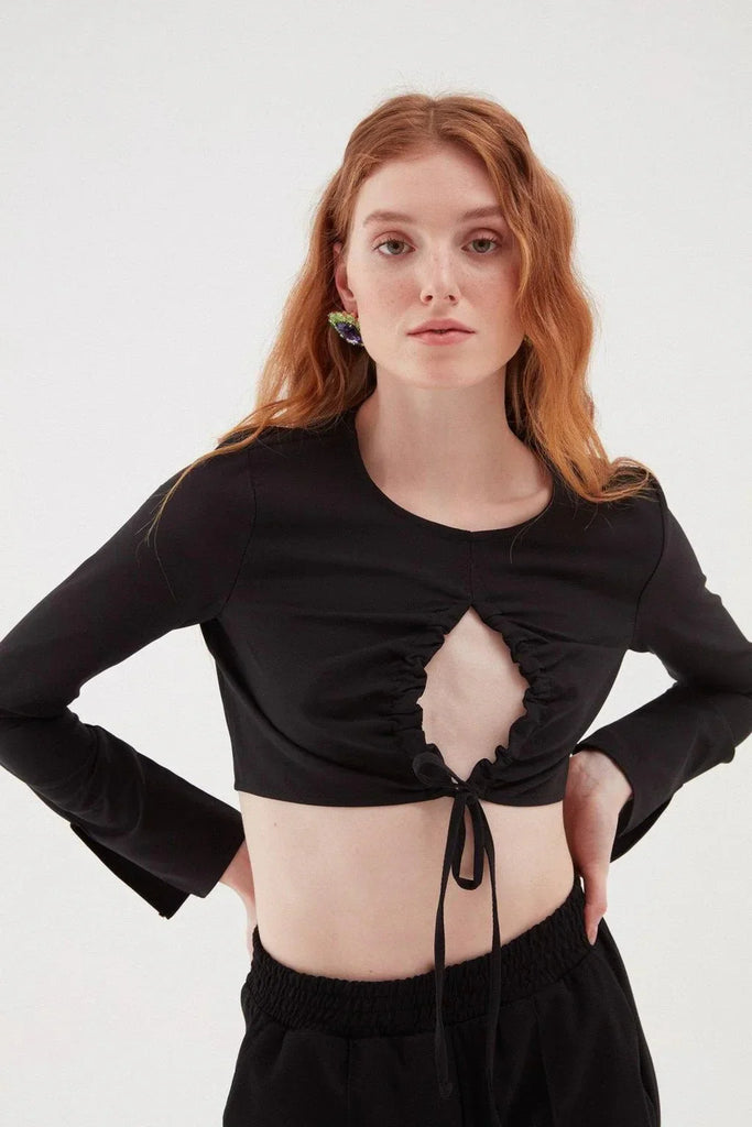 The long-sleeved crop blouse model, which attracts attention with its decollete detail on the front, takes its place among the complementary pieces in your combination. you can adjust the smocked part as you wish. the back has a hidden zip.