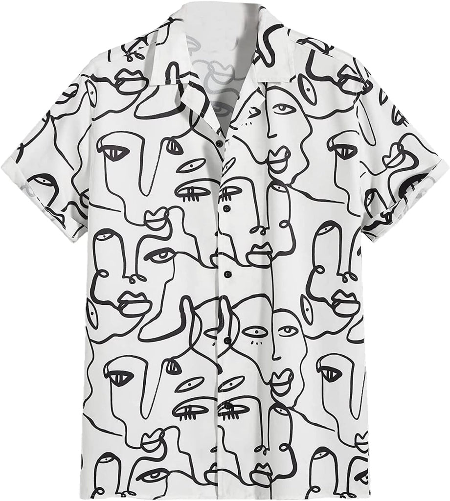 Women's Figure Print Short Sleeve Button Down Shirt Graphic Top Black White